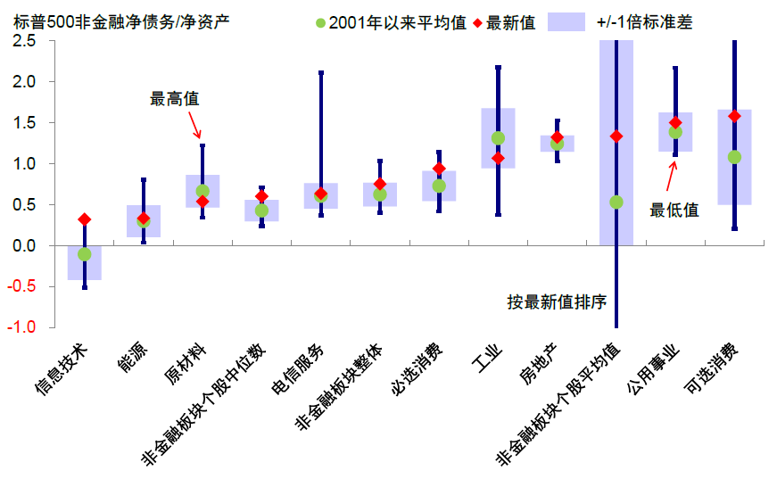 图表:截至2Q22,可选消费、信息技术杠杆水平明显高于均值,而工业、原材料、能源等相对健康