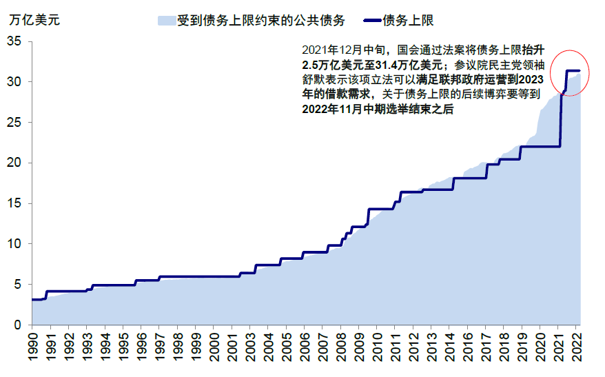 我们测算,当前利率抬升会增加付息成本但也并不算很夸张,2023年约占GDP2.2%、占财政支出9.8%。因此,美国政府债务偿付的压力和约束更多体现在立法的限制上,即“债务上限”。我们测算还需5~6个月(2023年一季度)会触及31.4万亿美元的债务上限。