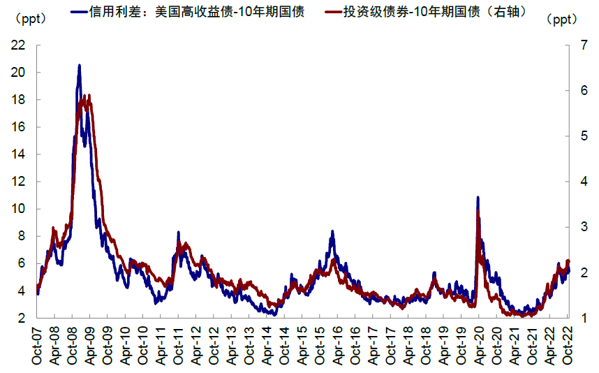 图表:美国投资级和高收益债利差已快速攀升至超过2018年底水平,为扣除疫情后的2015年底以来新高