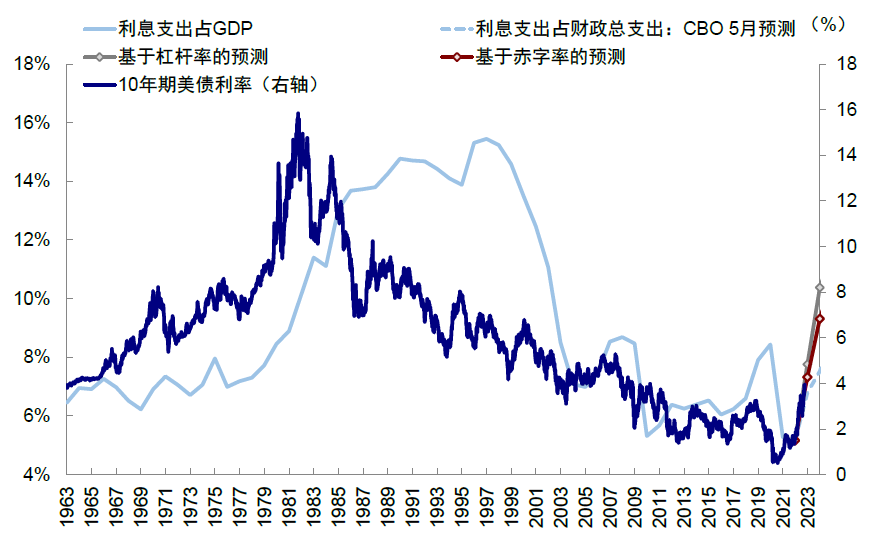 我们测算,当前利率抬升会增加付息成本,但也并不算很夸张,这主要是由美债存量的期限和付息结构决定的。当前存量美债中超过70%为中长期国债,而利率升高的年内影响仅作用于短期国债、FRN和部分到期的中长期国债。2022年整体利息支出约4,466亿美元,占GDP的1.8%(vs. 2021年1.6%)、占财政总支出的7.5%(vs. 2021年5.2%),这一水平低于疫情前2019年8.4%的利息支出占财政总支出水平,也低于1962年以来9.3%的历史均值。2023年随着更多低利率债券的到期以及相对更高利率的国债存量增多,美国政府利息支出也将进一步抬升。我们测算,2023年整体利息支出或增加至5,936亿美元,约占GDP的2.2%(1962年以来均值1.9%)、占财政总支出的9.8%(1962年以来均值9.3%)。