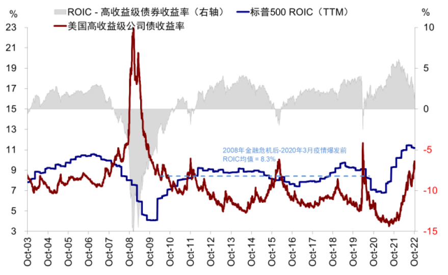 图表:当期美国高收益债利率已达9.7%,与美股ROIC利差已缩小到146bp