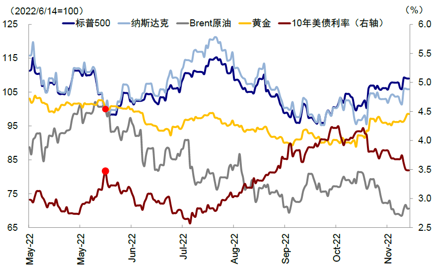 过去一周,10年美债跌至3.5%以下,一周内跌幅接近20bp,从10月高点累计下行80bp。相应的,美元指数在此期间降至105(9月底高点以来下跌8%以上),美股和黄金则普遍反弹。未来通胀和紧缩路径是否一马平川,各资产中对未来加息路径的定价是否合理?