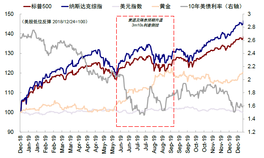 图表:2019年5月3m10s利差倒挂、衰退预期升温,黄金反弹明显