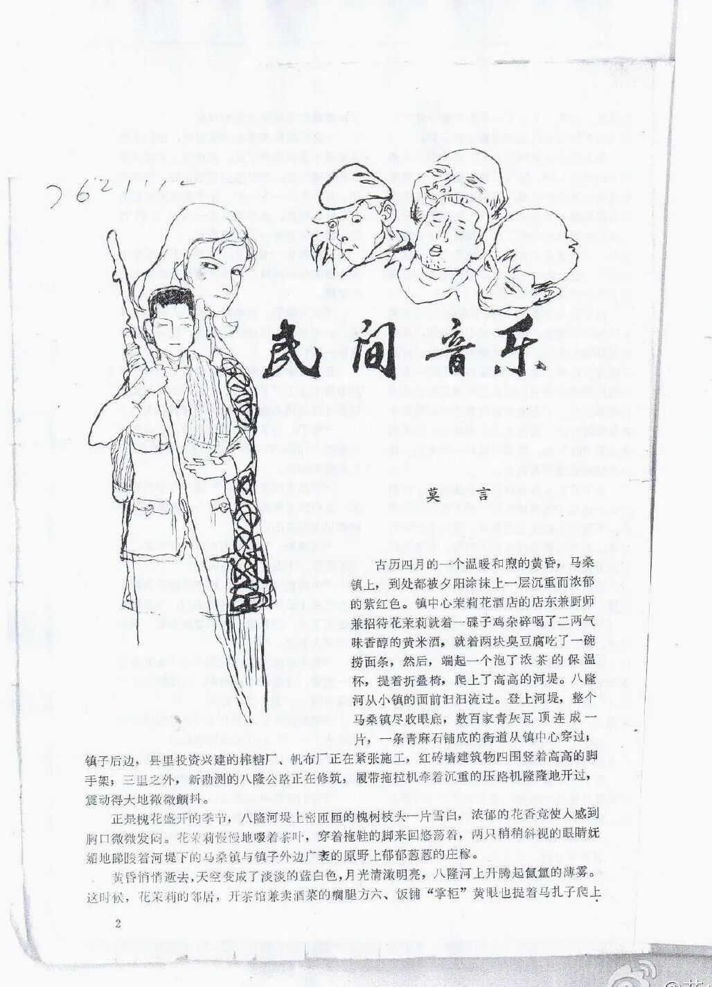 哥哥,你听得到我的声音吗?——这从远方一个最爱你的人心里发出的浸透着眷眷之情的音波。近来,人们都在谈论着“心灵感应”的事,对此我唯愿其真唯恐其假。我想,爱人的心应该是时刻相连、息息相通的。记得听老人说,从前,有一个母亲怀念儿子,就咬咬自己的手指,远方的儿子便心中疼痛,知道老母正在思念他……现在,我也咬住了自己的手指,直咬得隐隐作痛。但愿这信号已经传导给你,使你也知道我正在思念你,让你在这神秘的雨夜里也像我一样静坐在窗口,听听你这个饶舌的妹妹向你叙说我突然想起来的那些过去的、现在的和将来的事。哥哥,此刻,家乡上空正飘洒着霏霏的春雨。这雨从八点开始到现在已经下了两个多小时。村子已经进入梦乡,除了淅淅沥沥的雨声,再也没有别的音响。清爽的小风从窗棂间刮进来,间或有一两个细小的水珠飘落到我的脸上。哥哥,你还记得我的脸吗?你曾经吻过的那张脸。人家都说我俊,说我的脸是晒不黑的玉兰花瓣;你说我不丑,说我的脸像玉兰花瓣一样晒不黑。别人这样说是奉承我,而你是爱我才这样说。其实,我的脸是很容易晒黑的,如果你现在见到我,一定会用双手捧住我的脸说:“哟!我的玉兰花瓣怎么变成玫瑰花瓣了?”你一定会这样说,一定的,因为你爱我……△1981年第5期《莲池》(左);刊发于1983年《莲池》的《民间音乐》(右)。那个年代,地市级文学期刊,哪怕不大也能发表一流作品。——小K注