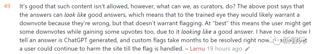 禁止这样的内容是好事,不过审核的人能做什么呢?上面有帖子说,这些AI生成的答案可能看起来像高质量答案,这意味着对于训练有素的人来说,可能会发现错误而点个踩。