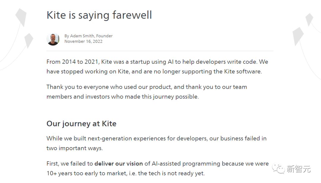 在发布于Kite官网的最后一期博客中,创始人Adam Smith认为「算法不够好」和「用户不买账」,是他们创业失败的主要原因。