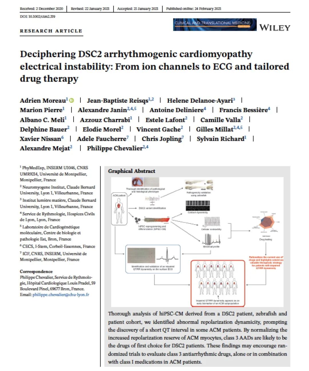 ACM的发病机制至今还不十分明确。医生常经验性地用抗心率失常药(AADs)对ACM患者进行治疗。此外ACM患者还常安装心脏自动除颤器。人工诱导的多能干细胞(hiPSCs)可用于疾病发病机制的研究。用来自ACM患者hiPSCs的心肌细胞(hiPSC-CM)进行研究,希望对心率失常的起源有更加深入的认识。2021年2月24日,Clinical and Translational Medicine期刊在线发表了法国 Philippe Chevalier 教授团队的最新成果 “Deciphering DSC2 arrhythmogenic cardiomyopathy electrical instability: From ion channels to ECG and tailored drug therapy”[6]( 点击文末 “阅读原文” 下载PDF全文 )。在本项研究中作者及其团队对DSC2 ACM患者的 hiPSC-CM 进行了全面的功能性描述,揭示了原发性电异常和对AADs的反应性。值得注意的是,作者发现低心率下短QT间期是DSC2 ACM的特征。