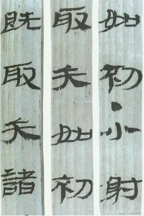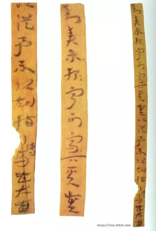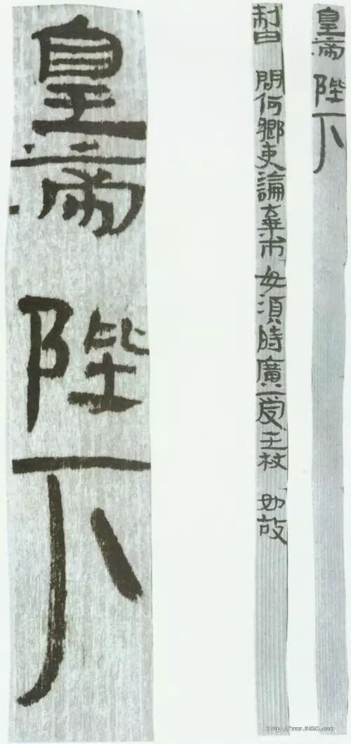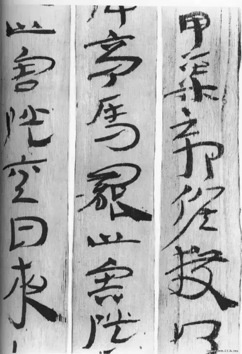 汉简在书写思想上没有受到那么多的束缚,因此,表现出丰富的创造力,最终成为由篆隶向行揩转化的过渡性书体——汉简。在《居延汉简》、《武威汉代医简》中有大量的墨迹出现,这可以和敦煌的《敦煌汉纸墨迹》相比较。体势近楷书、行书等各种书体。从竹木简所看到的书法艺术,是研究秦汉书法的第一手