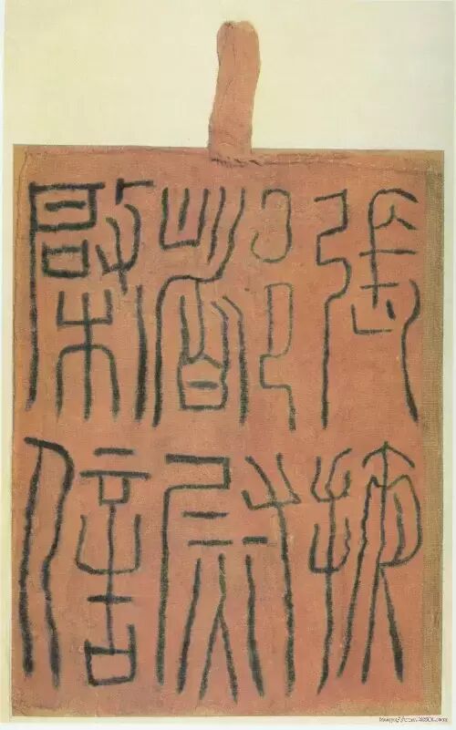 “张掖都尉启信”为一件21厘米×16厘米见方的红色织物,上方正中缀系,正面墨笔篆书“张掖都都尉信”六字,居延出土。汉代篆书墨迹出土不多,此作结构方正,用笔细瘦方硬。