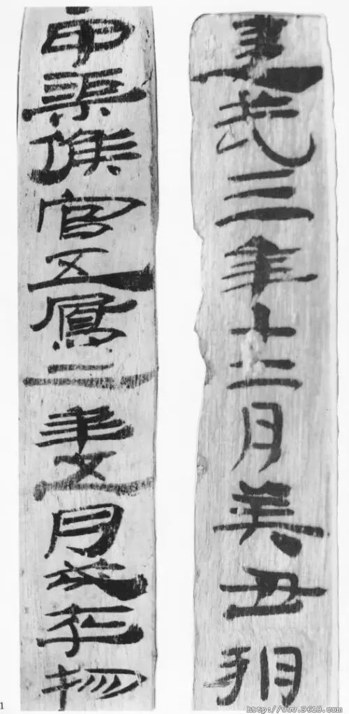 一九七一年,甘肃省博物馆在甘谷县汉墓中发现二十三枚木简。简长二十三、宽二点六厘米,松木制作,每简书两行,背面上端编写顺序号,连编成册后书写。简文整齐分为三节,可清楚地辨认出整齐秀丽的八分体字,但是大部分简牍已朽碎。