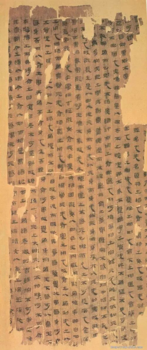 《马王堆帛书》用笔沉着、遒健,给人以含蕴、圆厚之感。它的章法也独具特色,既不同于简书,也不同于石刻,纵有行、横无格,长度非常自由。有强烈的跳跃节奏感。总体反映了由篆至隶的隶变阶段的文字特征。