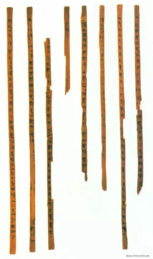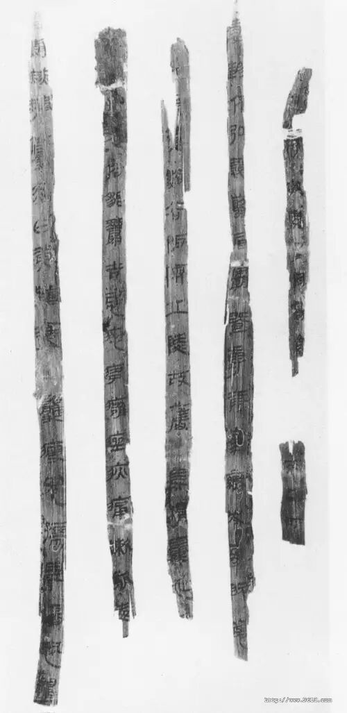 一九八六年,甘肃文物考古研究所在天水市北道区放马滩古墓群中的一号墓中发现竹简四八○余枚。竹简浸泡在棺液中朽腐严重,已发黑色,简文字体漫漶。竹简有二种形制,甲种长二十七点五厘米,宽○点七厘米;乙种长二十三厘米,宽○点六厘米。