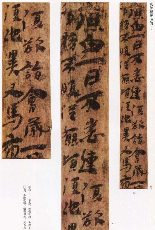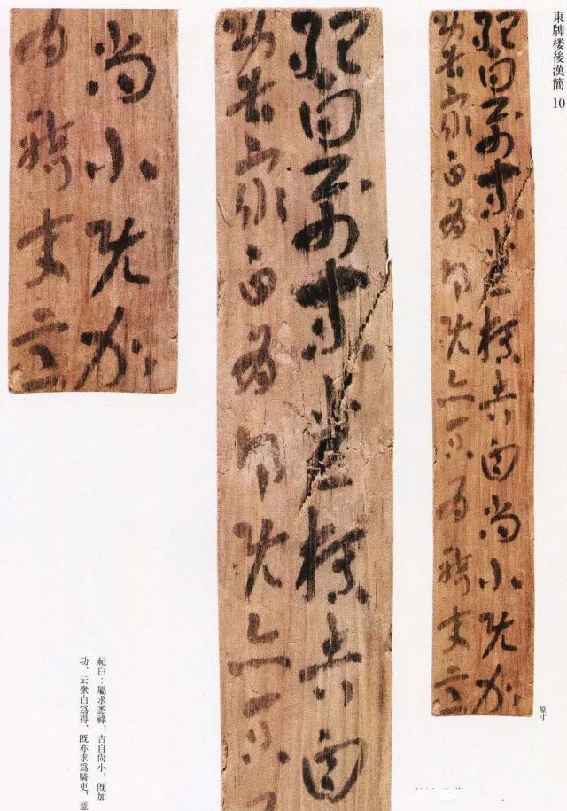 “长沙东牌楼汉简”,2004年出土于长沙东牌楼7号古井窖中,属于东汉后期的简犊。这批简犊计426余枚,其中218写有文字,内容大体是日常的文书;就书体而言,篆、隶、草、行、正书各具形态。有些简片上草书,虽还留有章草横势的影子,但绝去波碟己俨然是今草笔法。由此可见,东汉后期今草在日常书写中已具有普遍性和规范性。从这批汉简还可了解,行书和楷书在这一时期已初具面貌,不过就其规范性而言,不及今草成熟。