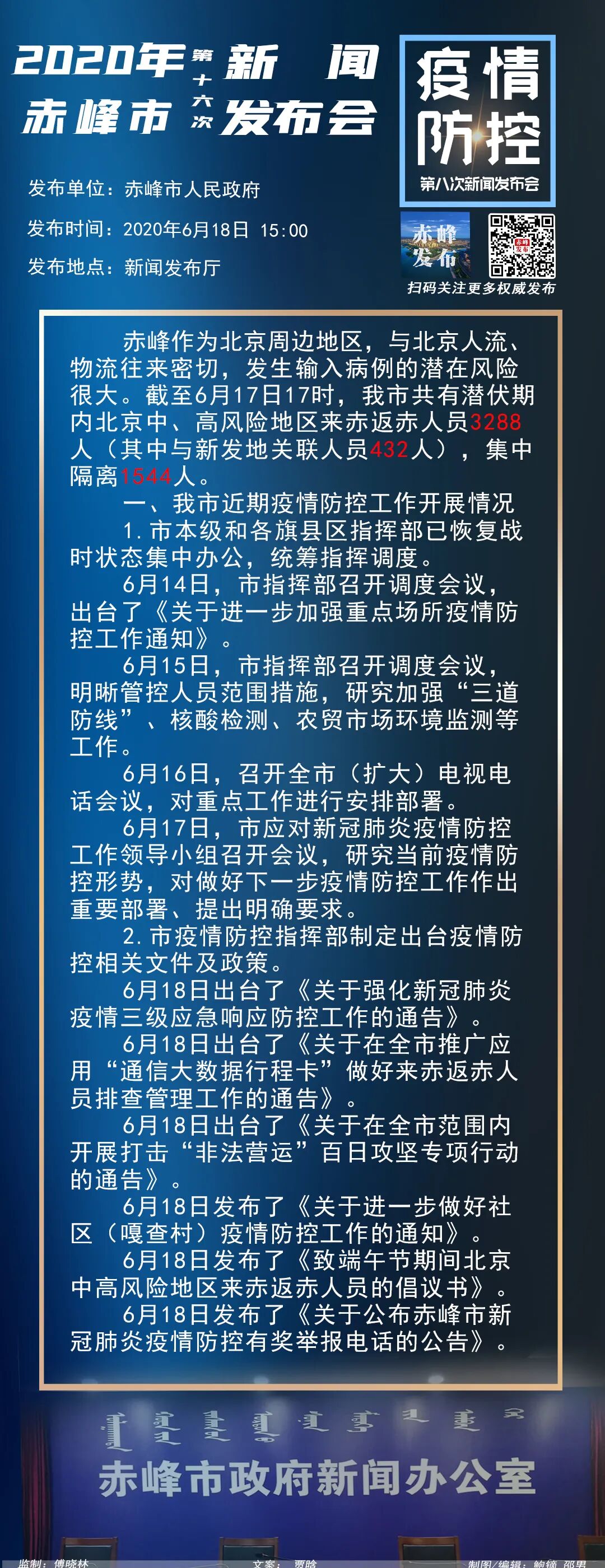 今天,市疫情防控指挥部又相继制定出台了《关于强化新冠肺炎疫情三级应急响应防控工作的通告》《关于在全市推广应用“通信大数据行程卡”做好来赤返赤人员排查管理工作的通告》《关于在全市范围内开展打击“非法营运”百日攻坚专项行动的通告》《关于进一步做好社区(嘎查村)疫情防控工作的通知》《致端午节期间北京中高风险地区来赤返赤人员的倡议书》《关于公布赤峰市新冠肺炎疫情防控有奖举报电话的公告》等6个方面的文件及政策,用最坚决的态度、最果断的行动、最严格的要求,落实落细防控举措,坚决防止疫情发生反弹。