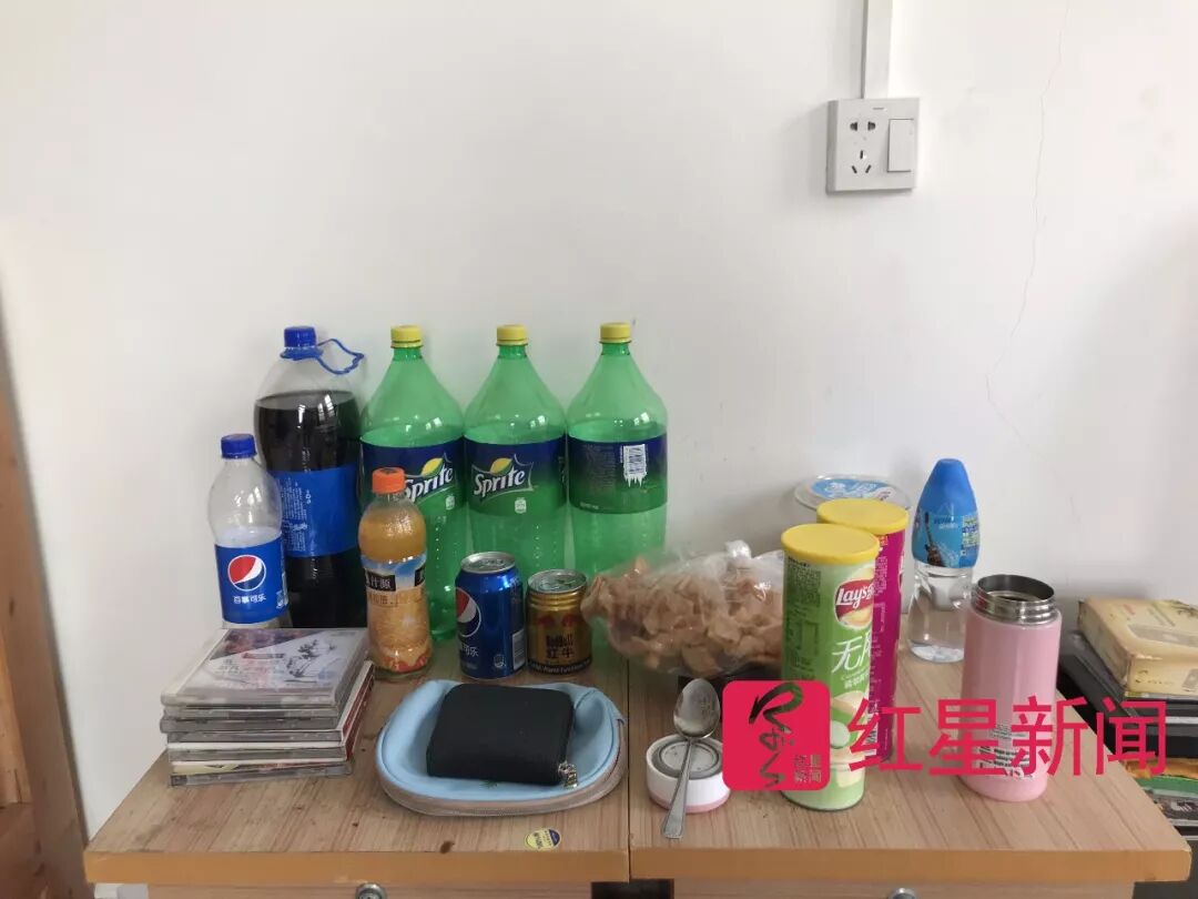 ▲床头柜上摆着舟舟爱喝的饮料和爱吃的零食 图片来源:红星新闻