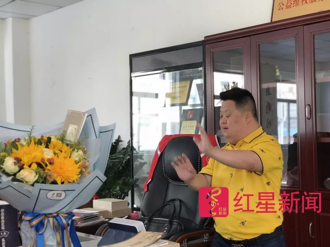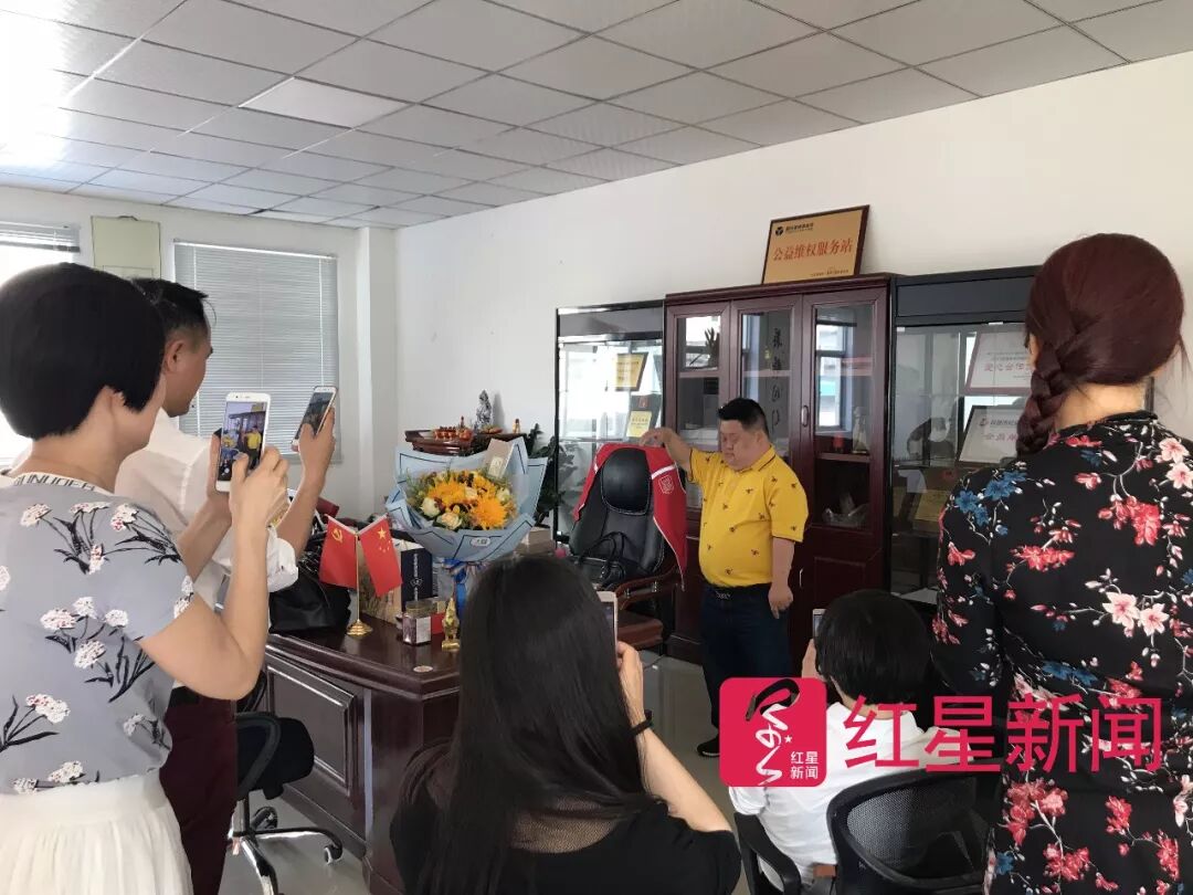一个女性公益组织负责人,捧来扎着蝴蝶结的礼盒,里面是一件亮黄色的POLO衫。另一位营销策划公司老板给他送了一部点读机,通过阿拉伯数字的排列组合,能听到交响音乐、诗朗诵或故事。