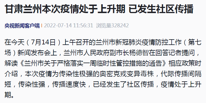 发布会上通报,13日10时至14日10时,兰州市新增本土确诊病例26例(其中无症状感染者转确诊病例11例),其中城关区21例(其中无症状转确诊7例),七里河区无症状转确诊1例,西固区无症状转确诊1例,安宁区3例(其中无症状转确诊2例);新增无症状感染者40例,其中城关区29例,安宁区10例,永登县1例。截至7月14日10时,本次疫情兰州全市累计报告本土确诊病例48例,无症状感染者145例。现有本土确诊病例和无症状感染者均在定点医院隔离治疗或隔离医学观察,目前情况稳定。会上介绍,本次疫情为传染性极强的奥密克戎变异毒株,代际传播间隔短,传染性强,传播速度快,已经发生了社区传播,疫情处于上升期。![]()