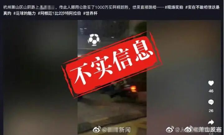 世界杯激战正酣,“为什么真的不建议你去赌球”话题也登上了热搜。有传言称一男子因赌球跳楼自杀身亡,还有人1800万元下注阿根廷后跳楼。虽然相关消息已被辟谣,但仍引发了网友的热烈讨论,“世界杯冷门让天台都拥挤了”。近期,已有多地公安机关发布提示信息,提醒社会公众拒绝赌球,谨防上当受骗。