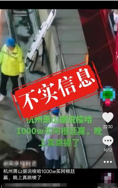 11月22日晚,浙江杭州山阴路附近有人坠楼,网传此人是世界杯赌球输了巨额的钱。