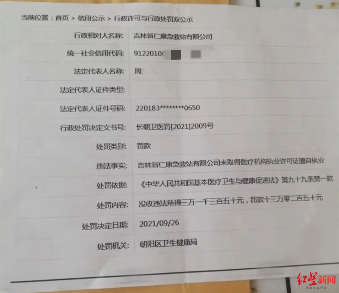 一份《吉林大学第一医院院后病人转运服务合作协议》显示,2019年,吉林大学第一医院(即吉林大学白求恩第一医院)与长春东业投资信息咨询有限公司(下文简称长春东业公司)签订协议,约定双方对院后病人转运服务进行运营合作。如果在吉林大学第一医院住院的病人及家属有院后病人转运的需求,可直接向长春东业公司提出。长春东业公司以自己的名义为病人及家属提供转运服务,自负盈亏。院方允许长春东业公司在院内开展院后病人转运服务,并对转运服务工作进行监督管理。协议第五条约定,长春东业公司方有权向病人或家属收取转运服务费用,且未经院方允许,长春东业公司人员不得到封闭管理的病房内部接送病患。长春东业公司应保证配备不少于8辆病人转运车辆,以满足住院病人转运需求。协议第七条约定,“本合同自乙(长春东业公司)方将其8辆运营车辆的营运许可手续办理完毕之日起生效。”天眼查显示,长春东业公司的法人代表为周某某。该公司的投资企业为吉林省仁康急救站有限公司,法定代表人也是周某某。吉林省仁康急救站有限公司的营业执照显示,该公司2019年5月成立,经营范围包括救护车租赁、特种车辆销售、救援服务等。吉林省仁康急救站有限公司在《关于患者刘丽丽转运事件的情况说明》中称,该公司主要开展出院患者转运服务,不含急救医疗范畴。转运途中,虽然对患者进行监护吸氧,但“不具备急救措施”。这意味着,该公司提供的车辆,虽然外观与救护车相似,且写有“吉林大学白求恩第一医院”字样,但并非院方所属车辆,也并非“救护车”,而是“院后转运车”。但同时,院方也对转运公司的行为具有监管责任。虽然出院时,患者病情危重,但“不具备急救措施”的车辆依然承担了转运患者的工作。红星新闻记者致电吉林省仁康急救站有限公司相关负责人,对方表示拒绝答复任何问题。“我希望提醒其他患者,对不具备相关资质的‘救护车’提高警惕,注意甄别,及时保留证据,以免更多的悲剧发生。”张女士对红星新闻记者说。