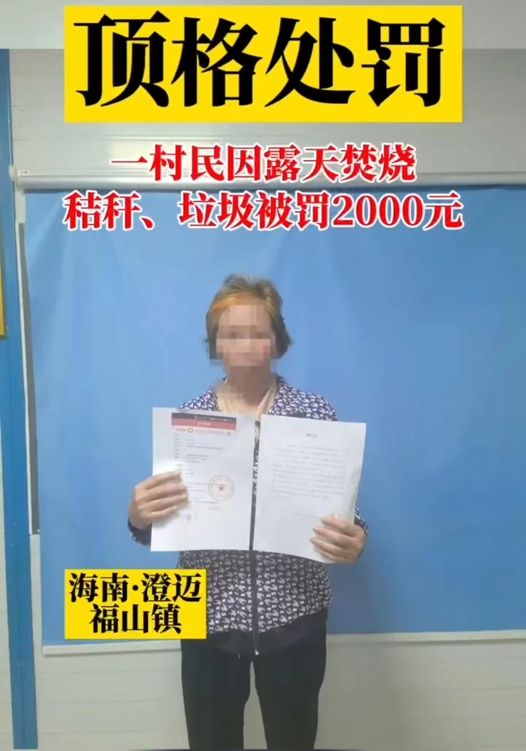再插一句,5天前,海南澄迈县富山镇,一位村民因露天焚烧秸秆被顶格处罚,罚了2000元。
