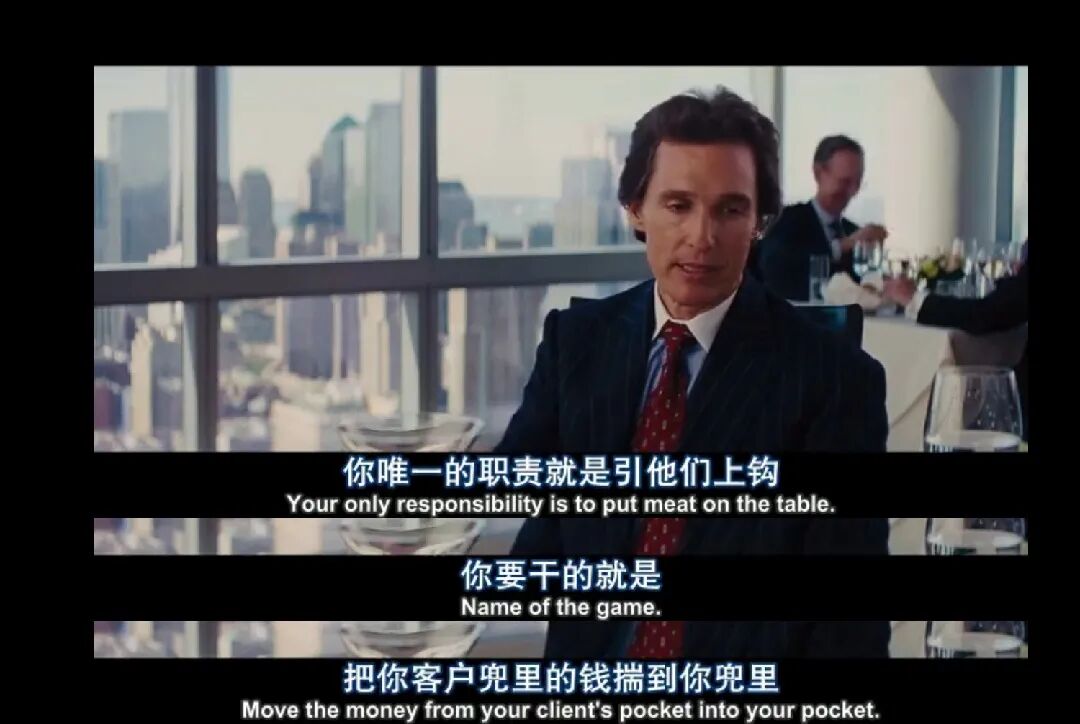 以至于有很多股票小白都来问老徐,“现在去炒股,还来得及吗?”“我手上还有点闲钱,要不要去试试呢?”到底要不要试,我相信讲完今天这部电影,大家就心中有数了。这个改变了无数股民生活的日期,同时也改变了乔丹•贝尔福(莱昂纳多·迪卡普里奥)这样千千万万股票经纪人的生活。一夕之间,乔丹刚在华尔街立足,就又不得不离开华尔街。由于卖出的都是极为廉价的股票,所以经纪人可以获得的佣金极高。乔丹卖出蓝筹股的佣金是1%,然而卖出仙股的佣金是50%。乔丹在这家小小的股票经纪所展现了他巧舌如簧的口才。第一单,他就轻而易举地卖出去4万股,转手就是两千块进袋。他们都不是正经股票经纪人出身,但是他们有一个共同的特点,那就是很能卖东西。他们开始把目光转向有钱人,他们包装了一家皮包公司,取了一个听起来很有蓝血血统的名字。虚假的蓝血公司,虚假的绩优股,为乔丹和他的门徒们换来一张张真实的钞票。他们赚的盆满钵满,没有人会嫌弃钱多,没有人会面对着稳赚不赔的买卖无动于衷。乔丹就这样用垃圾股缔造了自己的王国,用别人口袋里的金钱创造了自己的狂欢派对。乔丹再一次在华尔街崭露头角,甚至有媒体对他进行专访。只要乔丹点头雇佣他们,这些年轻人甚至愿意放弃自己的学位证书。然而对于斯特拉顿·奥克蒙特的每一个员工来说,乔丹是一个信仰。当乔丹迫于FBI的调查,想要激流勇退拿钱走人的时候,员工们都不约而同地表现出他们的沮丧。