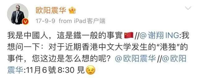 2017年,香港中文大学有标语涉嫌“港独”,有网友就这件事询问欧阳震华,他斩钉截铁地回答:“我是中国人,这是铁一般的事实。”