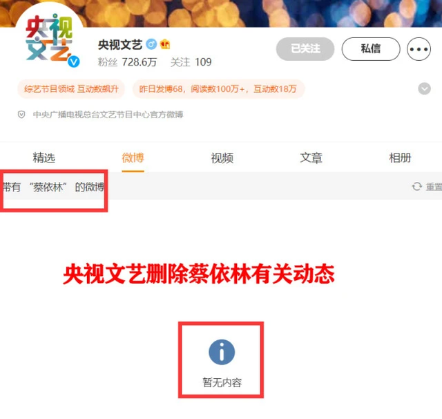 8月4日,央视发布了一条宣传蔡依林歌曲的微博,但没过多久,这条微博就被删除了,有关她的动态全部被清空。