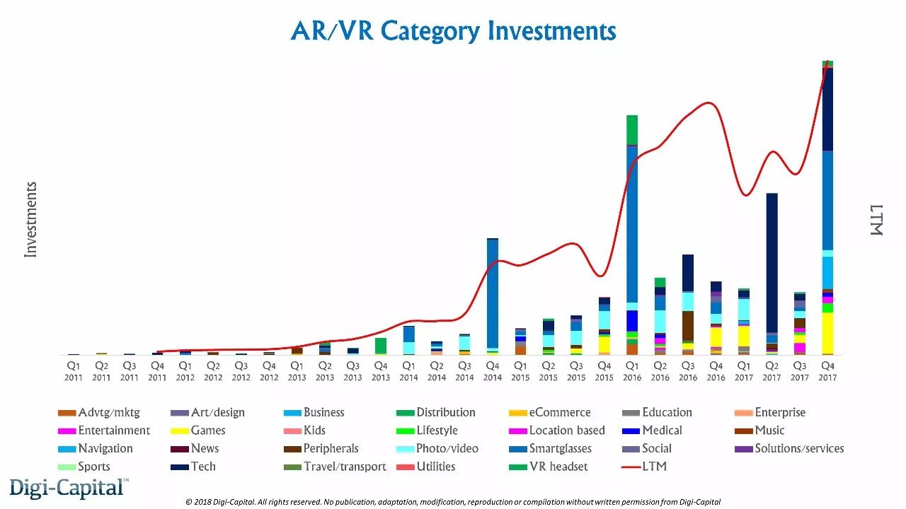 据Digi-Capital的最新统计数据,2017年全球虚拟现实和增强现实创业公司共获得超过30亿美元的风险资本。总体来看,虽然媒体的新鲜劲有所降温,但与2016年相比,投入到该行业的资金仍保持热度,继续增长。