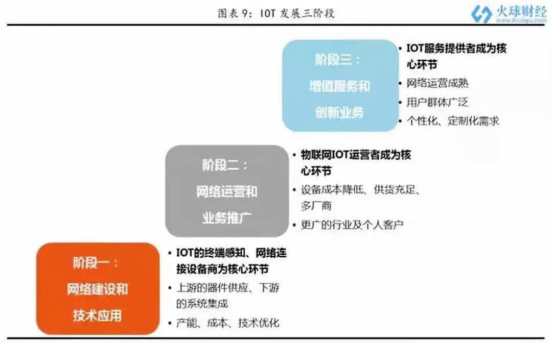 回顾和分析电信网、互联网、移动互联网过去的发展路径,我们发现物联网IOT发展存在三个阶段: