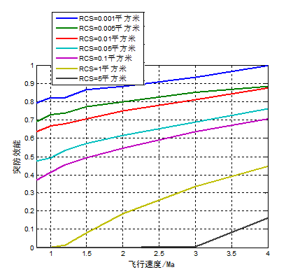 图5 不同RCS情况下,飞行器飞行速度变化(0.8Ma~4Ma)对突防效能的影响曲线