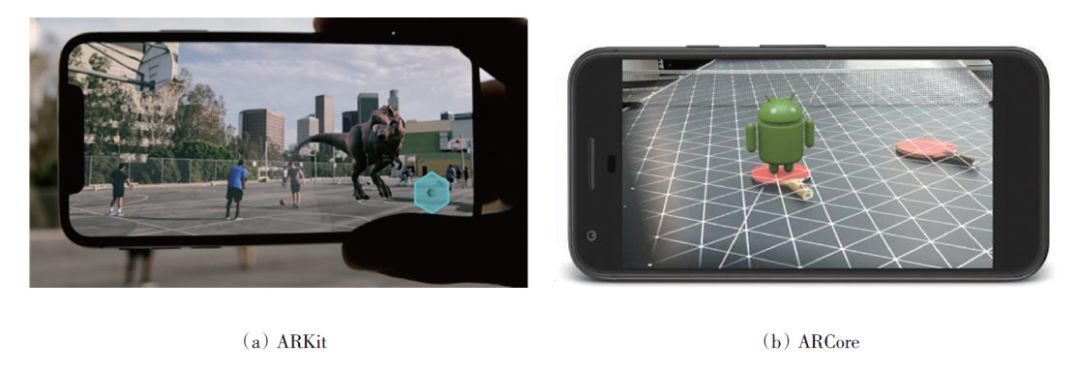 在一些增强现实的应用场景,基于计算机视觉与基于传感器的方法均不能获得理想的跟踪效果,因此,研究者综合考虑二者的优缺点,将二者结合起来,以获得更优的跟踪注册效果。香港科技大学沈劭劼课题组提出的视觉惯性导航(visual-inertial navigation system,VINS)系统将视觉与陀螺仪和加速度计信息深度融合,在无人机和手持移动设备上均获得了较好的跟踪注册效果;苹果公司推出的ARKit和Google公司推出的ARCore增强现实软件平台分别支持iOS和Android操作系统,为移动端智能设备上的增强现实应用提供了无限可能。图3展示了在ARKit和ARCore平台上开发的移动设备上的增强现实应用示例。