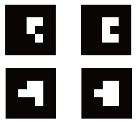 基于人工标志的方法一般将包含有特定人工标志的物体放置在真实场景中,通过对摄像机采集到的图像中的已知模板进行识别获得摄像机位姿,之后经过坐标系的变换即可将虚拟物体叠加到真实场景中。基于人工标志的方法最具代表性的是ARToolkit和ARTag。ARToolkit通过使用人工标志实现了快速准确的跟踪注册,但其在遮挡敏感;ARTag采用数字编码的方式在一定程度上增加了对遮挡的处理能力。图1展示了ARToolkit 中人工标志示例。图2展示了ARTag中的人工标志示例。