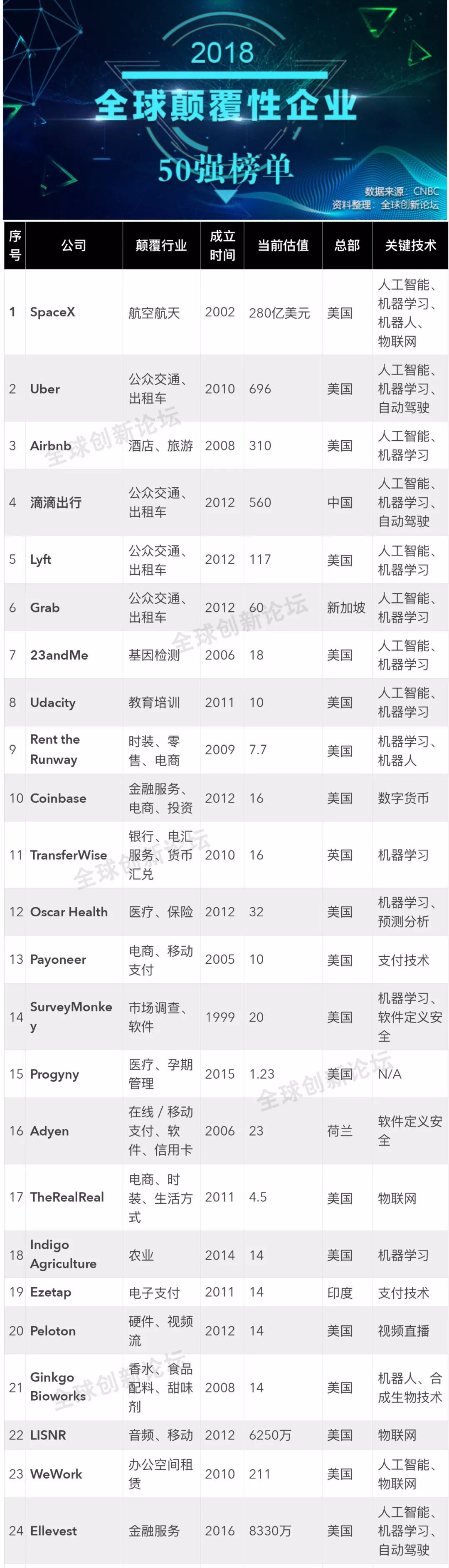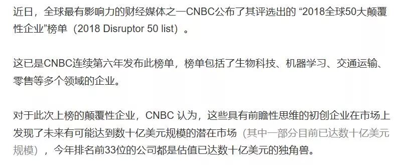 日前,全球最有影响力的财经媒体之一CNBC公布了其评选出的 “2018全球50大颠覆性企业”榜单(2018 Disruptor 50 list)。