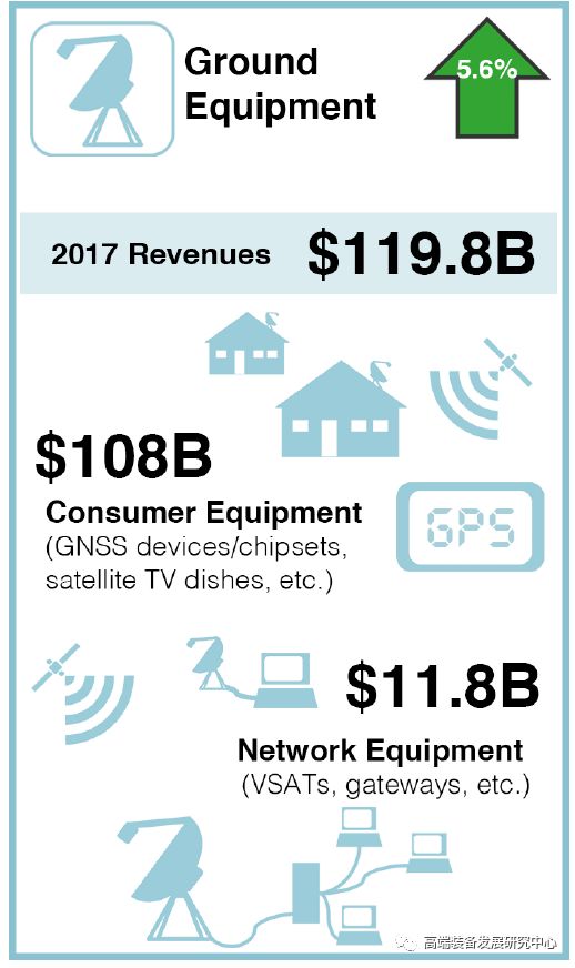 5)地面设备:地面设备收入达到1198亿美元,同比增长约为5.6%。增长主要在于全球卫星导航系统和网络设备的增长,用户设备基本保持平稳。地面网络设备产业收入为118亿美元,占比约10%;用户设备产业收入为1080亿美元,占比约90%。