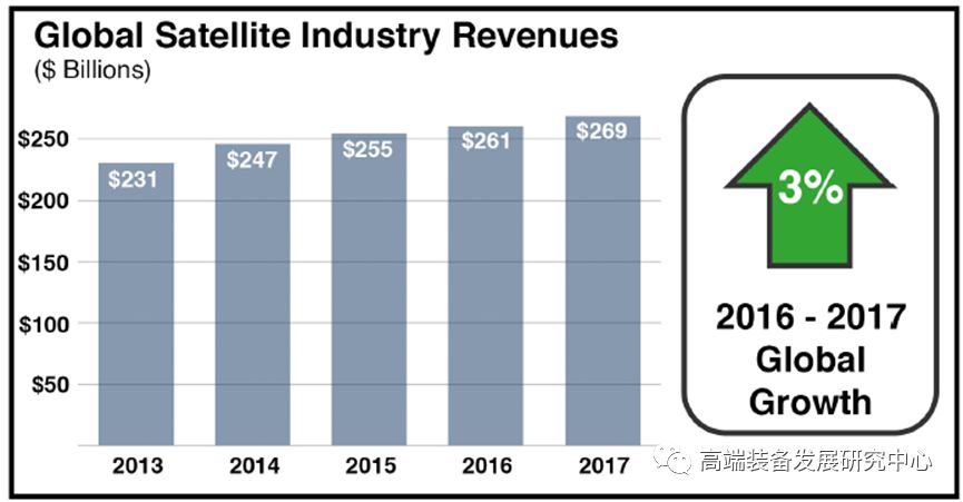 2)卫星产业收入:2017年,卫星产业总收入约为2690亿美元,同比增长3%,约占空间产业总收入(3480亿美元)79%。