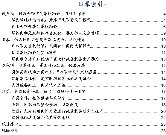 风险提示:军民融合政策出台时间存在较大不确定性,对企业军民融合进度影响显著;国际局势存在不确定性,影响国内相关产业发展进程。