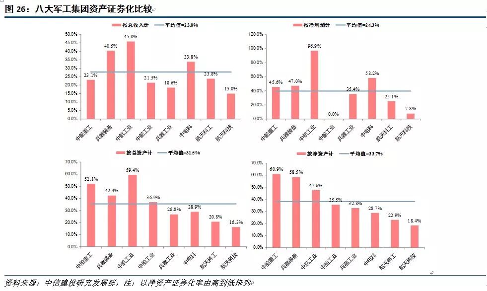 整体上看,除中船重工、兵器装备、航空工业之外,航天科技、航天科工、中电科、兵器工业和中船工业的资本运作潜力仍然较大。以净资产资产证券化率计:中船重工、兵器装备、航空工业走在前列,均达到40%以上,而中电科、航天科技和航天科工整体偏低,均在30%以下,低于平均水平;以净利润资产证券化率计:航空工业上市公司贡献了集团96.9%的净利润,中船重工为45.6%,中电科为58.2%,兵器装备为47.0%,而航天科技、航天科工、中船工业、兵器工业仍有较多的盈利资产分布在上市公司体外。