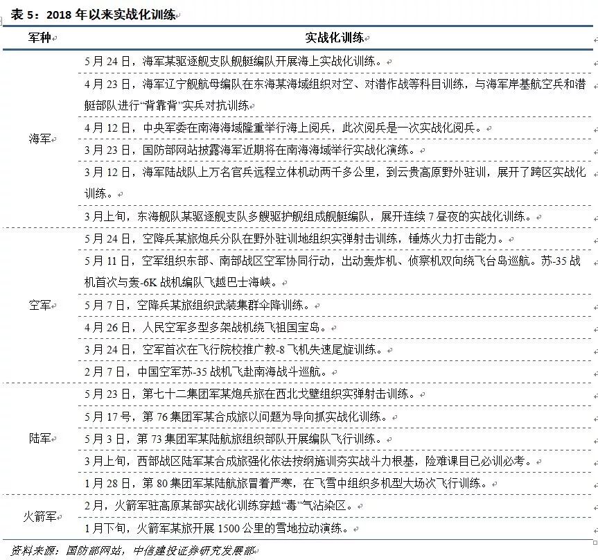 首批新军事训练大纲下发,实战化成为关键词。2018年1月3日,中央军委首次统一组织全军年度开训动员,习主席要求坚持实战实训、联战联训,坚持按纲施训、从严治训。开训动员后,2018年全军军事训练正式拉开帷幕。1月份,经中央军委批准,解放军首批新军事训练大纲正式颁发,这标志着新体制下军事训练内容体系构建取得重大阶段性成果,为部队按纲施训提供了基本依据。与以往的军事训练相比,新大纲增加了训练时间,提高了训练难度强度,加大了训练消耗,强调把技能练到极致、武器用到极致,增加武器装备极限性能、边界条件、干扰条件、复杂环境下操作和实战运用训练。