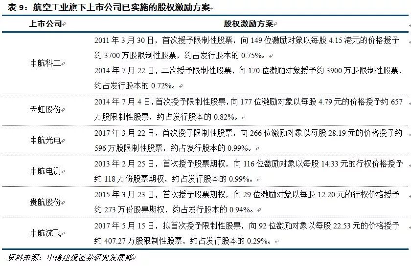 军工混改重点关注央企上市公司员工股权激励进展,核心军品上市公司股权激励首单落地,后续案例有望持续推出。员工股权激励是混改的重要组成部分,通过绑定股东与员工利益,有助于军工央企降本增效并释放业绩。航空工业的员工激励方案走在了最前列,近年来开展了一系列中长期激励试点工作,旗下上市公司包括中航科工、天虹商场、中航光电、中航电测、贵航股份已向董事、高管以及核心员工授予了限制性股票或股票期权。5月15日,中航沈飞发布《A股限制性股票长期激励计划(草案)》,作为军品整机类上市公司,其股权激励计划示范意义重大,标志着核心军工资产实施股权激励或已突破体制障碍。