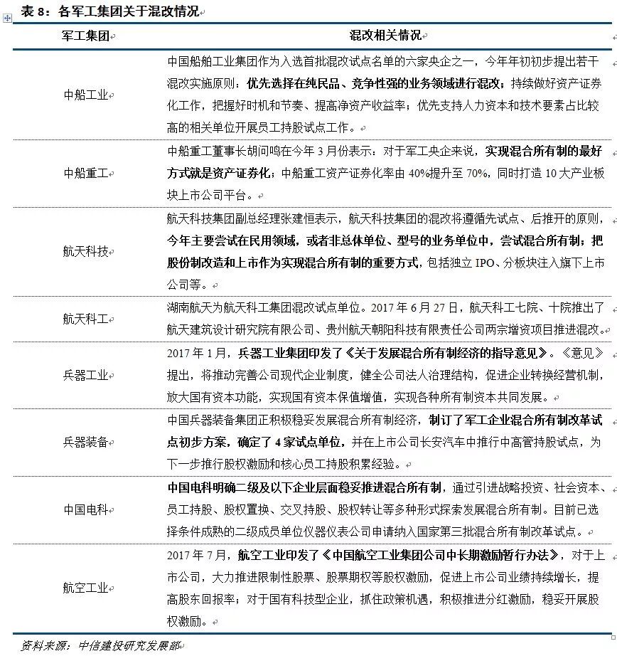 混改是国防科技工业体制改革的润滑剂。1、通过混改引入社会资本推动军工技术向民用领域的转移转化,实现资本、技术、市场多个维度的军民融合,实现军工央企由输血向造血转变;2、通过混改引入市场化薪酬体系、员工持股等激励手段吸引人才、留住人才。员工持股政策明确要优先由科研院所转制的企业,这也将为军工科研院所改制做好铺垫。军工集团积极响应混改,其中中国船舶工业集团是入选首批混改试点名单的六家央企之一,兵器工业集团、兵器装备集团等相继出台了混改相关文件,其他军工央企也已陆续跟进。