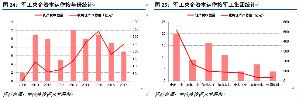 军工央企2018年资本运作有望回暖。2017年12月4日,国务院发布的《关于推动国防科技工业军民融合深度发展的意见》指出,鼓励符合条件的军工企业上市或将军工资产注入上市公司。自2009年至今,军工央企共进行资本运作77次,累计收购资产1600亿以上,军工集团资产证券化率获得较大提升。或因受政治周期影响,2012年和2017年资本运作数量较前一年明显下滑,参照2013年军工央企资本运作的恢复程度,预计2018年在混改、院所改制等国家政策支持下,军工央企资本运作有望回暖。
