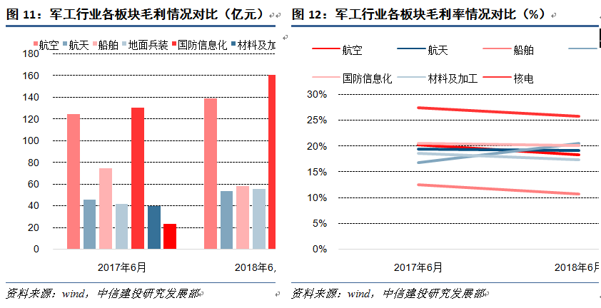 地面兵装、国防信息化和核电板块盈利能力较强。2018年上半年,国防信息化板块毛利为160.99亿元,同比增长23.02%;其次为航空板块,毛利为138.92亿元,同比增长11.66%;七大板块中仅有船舶板块同比下降,2018年上半年船舶板块毛利同比下降21.99%。虽然核电板块毛利不高,但毛利率水平在七大板块中位列第一,2018年上半年核电板块毛利率虽同比下滑,但仍达到25.85%,超过第二位地面兵装板块5.2个百分点;地面兵装板块毛利率达20.61%,是七大板块中唯一一个在2018年上半年毛利率提升的板块;国防信息化板块毛利率为20.10%,位列第三。