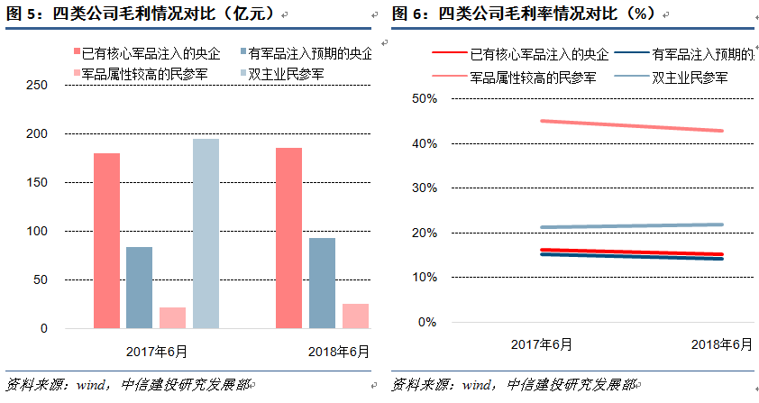 民参军企业盈利能力强于军工央企。2018年上半年四类公司毛利均有不同幅度的上涨,其中双主业民参军企业的毛利最高,达234.30亿元,同比增长20.36%,增幅也最大,核心央企位列第二,毛利为185.61亿元,同比增长2.99%。2018年上半年,核心民参军毛利率虽有下降,但仍是四类企业中最高的,达42.79%,其次为双民主民参军,相较于军工央企,民参军企业的盈利能力更强。