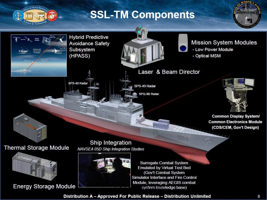 2009-2012年,美海军对一种名为“激光武器系统”(LaWS)的固态激光器原型机先后进行了对抗无人机的陆上和海上试验。LaWS的波束功率据报道为30千瓦。2010-2011年,海军在一系列试验中试验了名为“海上验证激光器”(MLD)的另一种固态激光器原型机,最终将该激光器安装在海军军舰上成功攻击了一艘小型船只。2014年8月,海军将LaWS安装于在波斯湾执行部署任务的“庞塞”号两栖舰上,对舰载激光器在作战环境下对抗蜂群小艇和蜂群无人机进行了评估。2014年12月,海军宣布“庞塞”号上安装的LaWS成为“作战”系统。2017年10月,“庞塞”号结束在波斯湾的部署返回美国,LaWS从该舰上拆除,将进行翻新,用作“配备集成光学眩目器与监视系统的高能激光器”(HELIOS)的陆基试验资产。