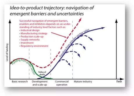 总之,《拜杜法》是聚焦在学研机构对于科技的早期研发,希望透过产、学、研的协作来解决许多好的科技在达到一定的研发程度时,虽然可以预见到很高的未来潜质,却因经费或人力的短缺(尤其是原有公家经费即将用罄,而新的私人天使或创投基金却还无法到位的青黄不接)而无法持续的困境。也就是如何克服并越过所谓的“死亡之谷”(valley of death,见图一中以圆圈标示出的区域),从而可以将科技的早期研究与后期开发连成一脉,形成一个完整的曲线。[25]