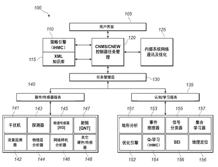 认知网络电子战(CNEW)是Rockwell Colins公司于2013年申请的专利,提出了一种认知电子战项目构架。CNEW系统的认知调度程序包括认知控制器,服务管理层以及网络管理三部分。认知控制器包括学习引擎、优化引擎、推理引擎、核实引擎以及确认引擎,这些引擎具备学习、自适应功能,并可控制传感器、探测器、信号分类器(包括特定发射机识别装置SEI)、干扰机、射频网络和地理定位单元。