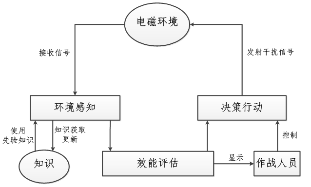 上图为典型的认知电子战功能组成框图,可以看出认知电子战作战形成了一个认知循环过程,整个体系包括环境感知、决策行动和效能评估三个模块。