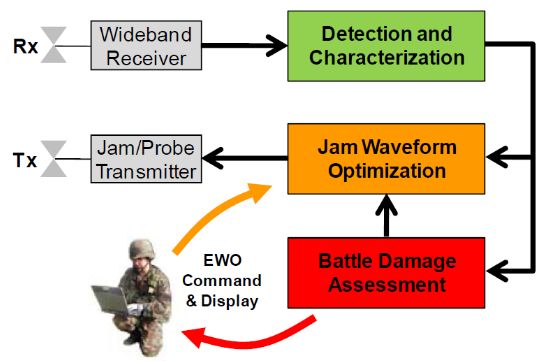 BLADE项目的核心技术是机器学习技术及相关自适应学习算法,其作战装备将实时分析器局部电磁环境,快速检测并描述威胁信号,对自身干扰装备的发射参数进行修改,自动合成最优化干扰波形,以达到最佳干扰效果。