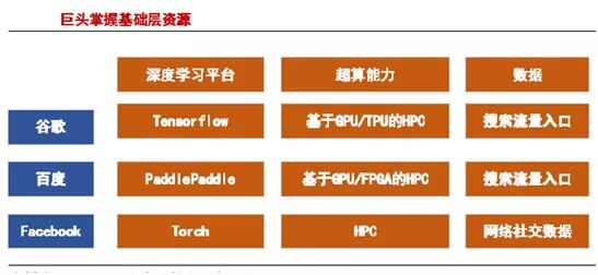 人工智能的基础平台需要三大要素:超算能力、顶尖的深度学习算法人才、海量的数据资源。每一样都有极高的门槛,这决定了基础层只能是少数巨头能够把控的领域。科技巨头长期投资基础设施和技术,同时以场景应用作为流量入口,积累应用,成为主导的应用平台,将成为人工智能生态构建者(如Google、Amazon、Facebook、阿里云等)。在某个行业应用场景数据资源相同的情况下,基础层的企业因为能够从最基本的神经网络模型算法作出相应的适配和改进,往往体现出其他企业难以超越的优势。